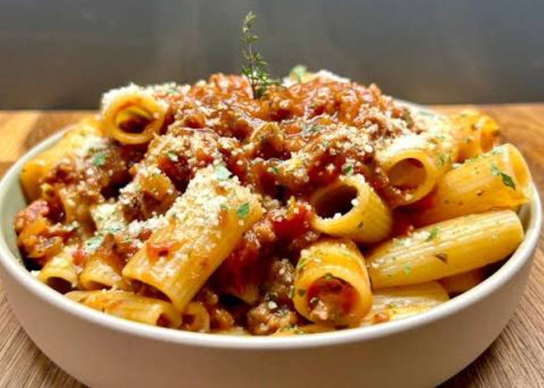 Rigatoni Garofalo n» 35 con chorizo criollo, tomate cherry, salsa de tomate, aceite E.V.O , sal , guindilla Diamante y grana Padano.