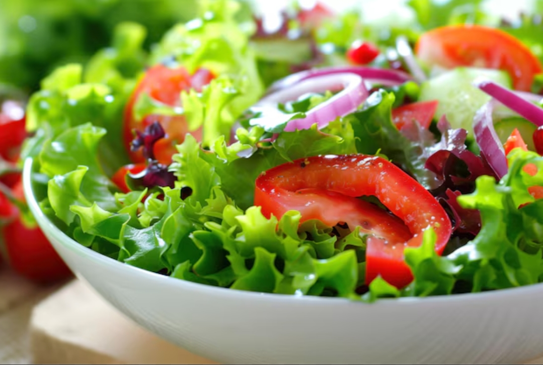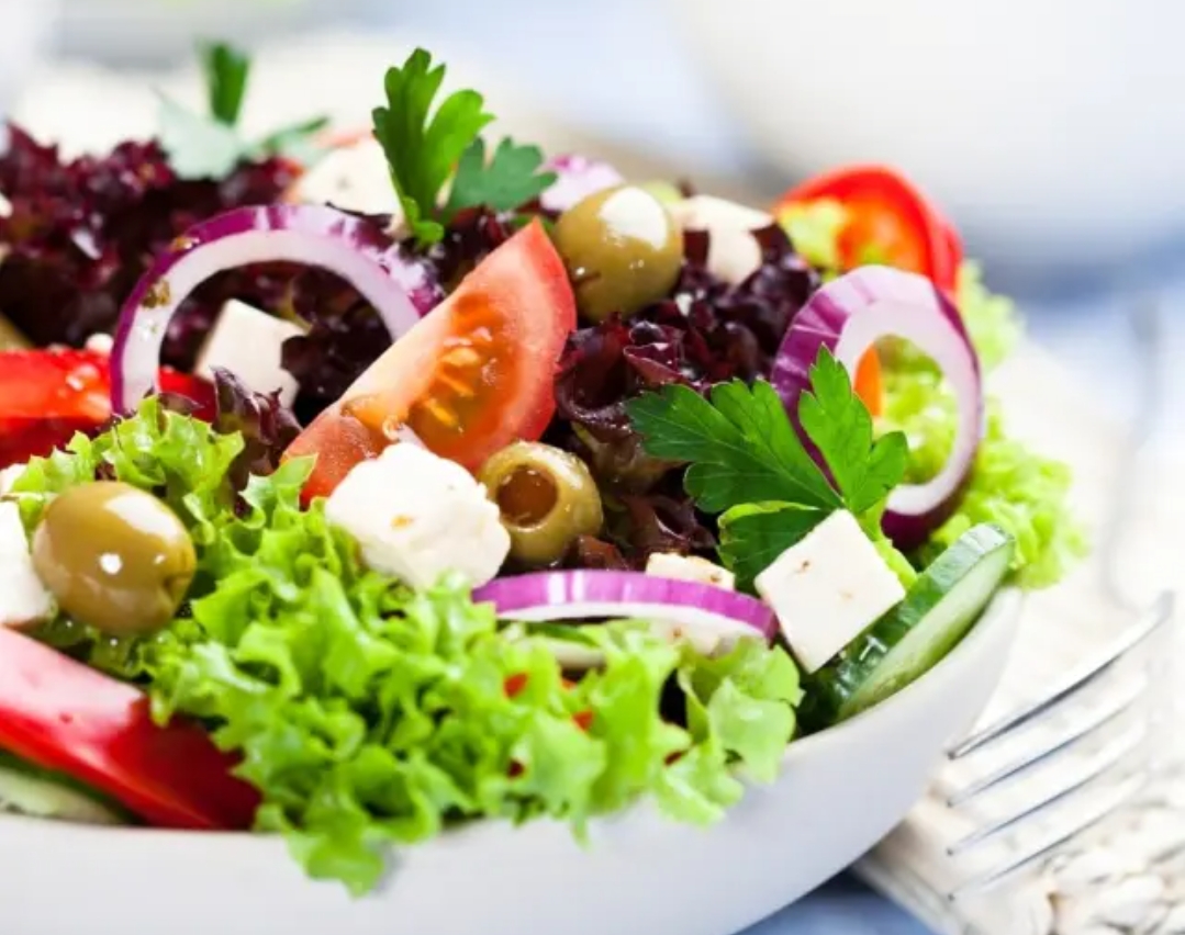 Ensalada, tomate, cebolla morada, pimiento rojo, aceitunas negras, maíz.