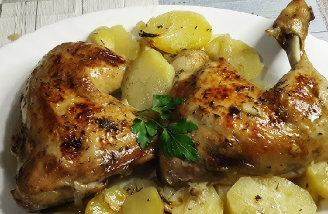 Trasero de pollo asado al horno con sal, ajo, pimienta negra , pimentón dulce y vino blanco acompañado de nuestras patatas al horno.